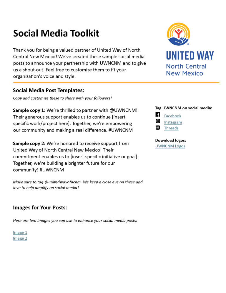 Thank you for being a valued partner of United Way of North Central New Mexico! We’ve created these sample social media posts to announce your partnership with UWNCNM and to give us a shout-out. Feel free to customize them to fit your organization’s voice and style.